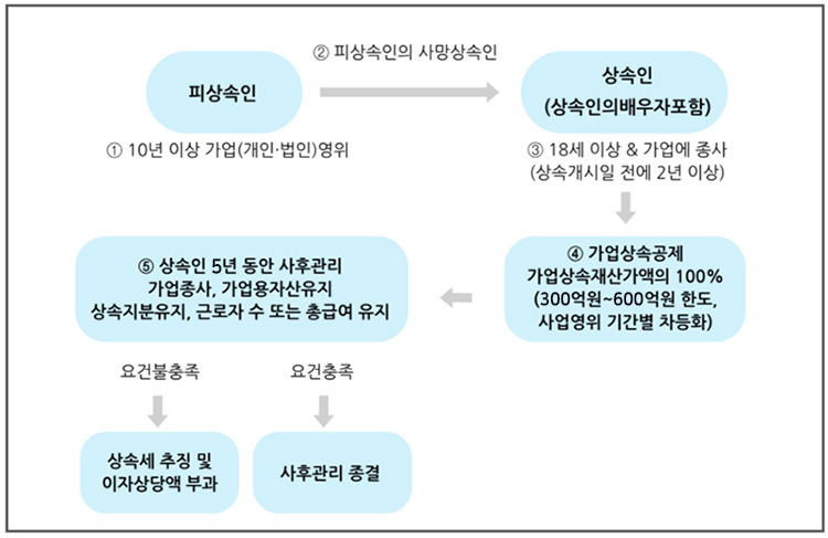 - 피상속인 : 최소 10년 이상 경영한 기업, 피상속인 포함 최대주주 지분 40%(상장 20%) 이상을 10년간 보유
